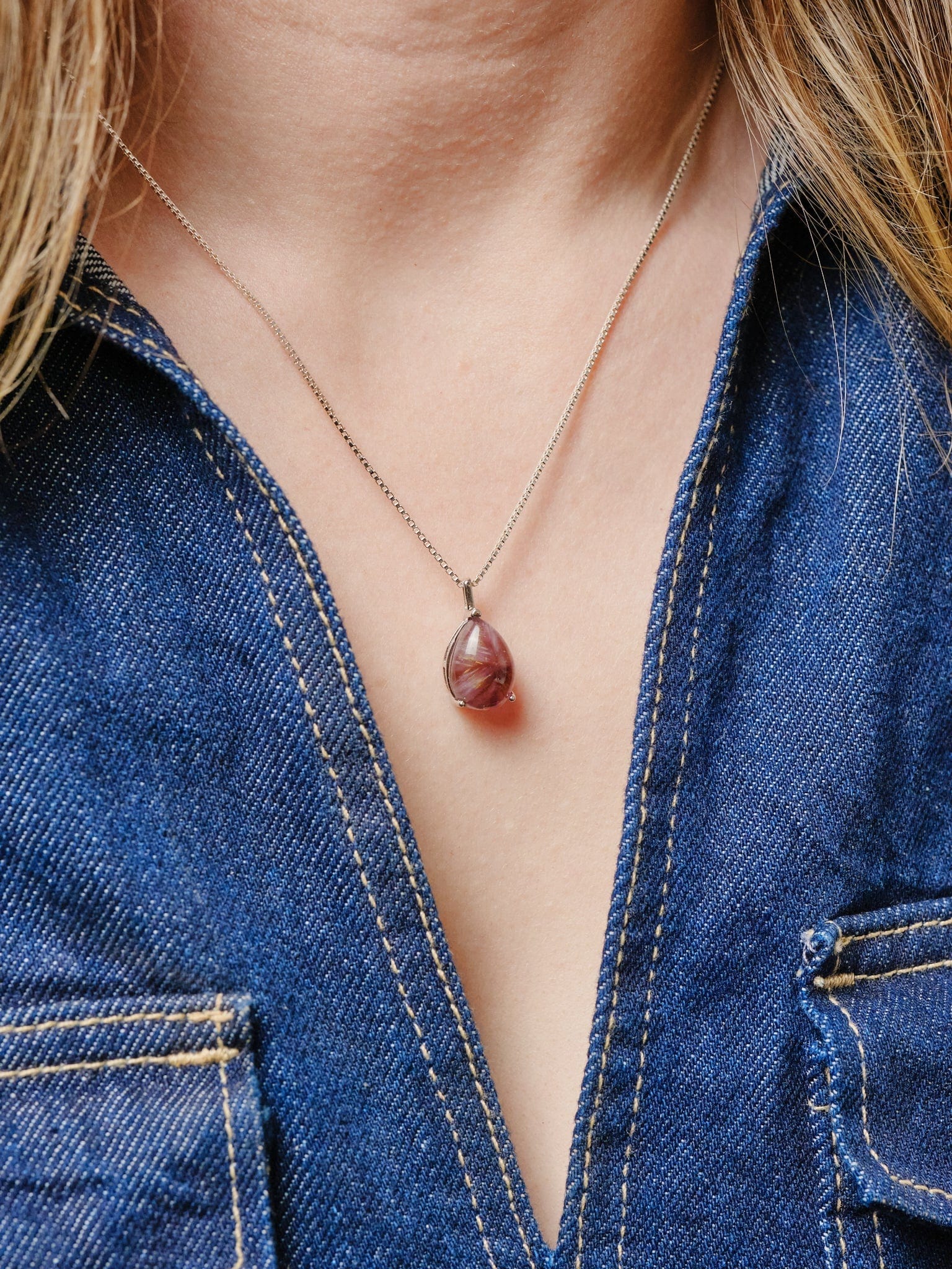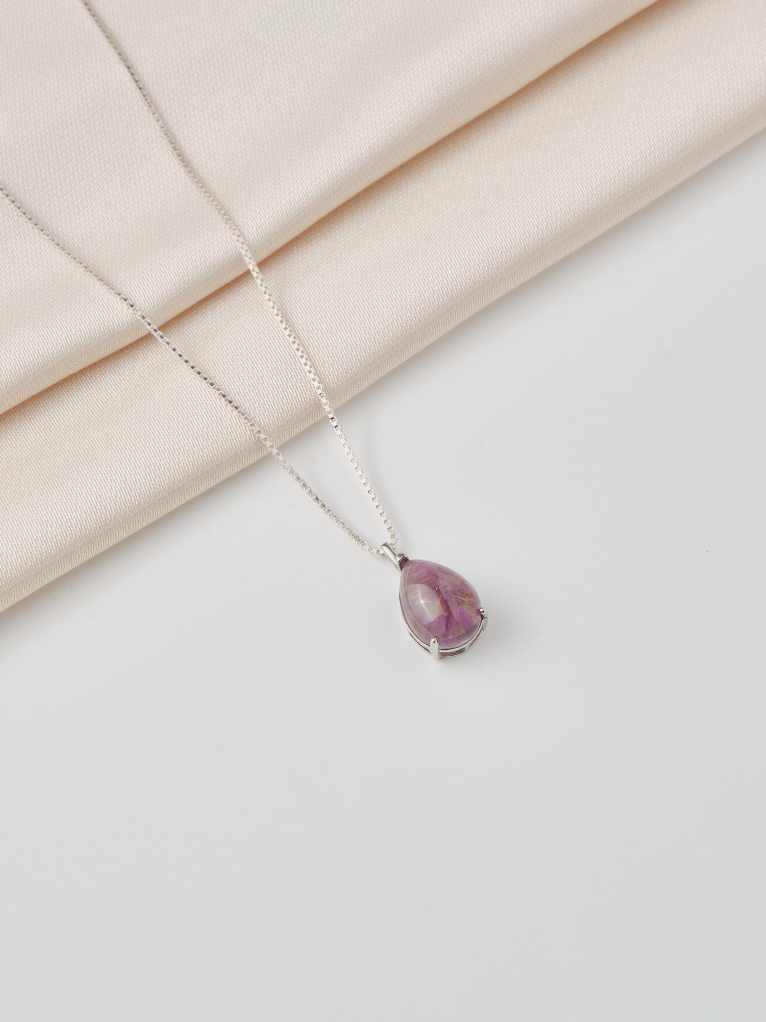 A Natural Super Seven Cabochan set in Sterling Silver. The gemstone contains a mixture of 7 different minerals; Amethyst, Cacoxenite, Goethite, Lepidocrocite, Clear Quartz, Rutile, and Smoky Quartz with a beautiful vitreous lustre. The Pendant sits on a 45 cms silver box chain with lobster clasp.